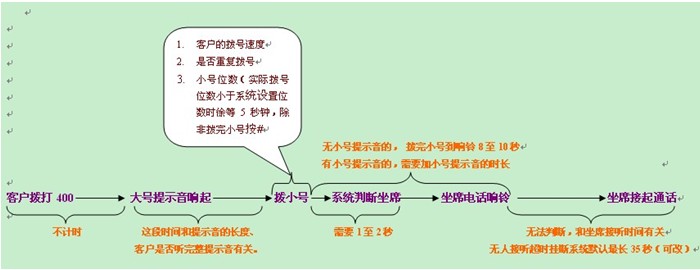 6. F到I这段时间的长度取决与坐席接听电话需要的时间,所以无法准确标注,一个坐席无人接听的状态下较长时间系统默认35秒(可改)。