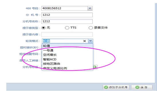 商家可按智能ACD、一号通、空闲较长和轮循时间的模式来接听访客的电话。见图