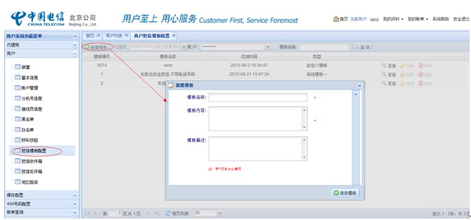 设置流程2:代理商后台——商户——短信模板配置——新建模板