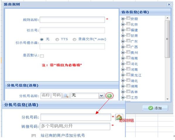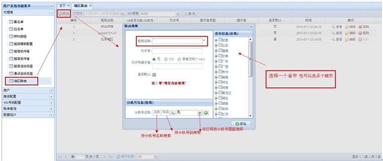代理商→地区路由→添加→规则名称(尽量添加容易区分的,例如:北京、上海、广州等等)→分机号名称(选择要添加的路由分机号)→添加;见图