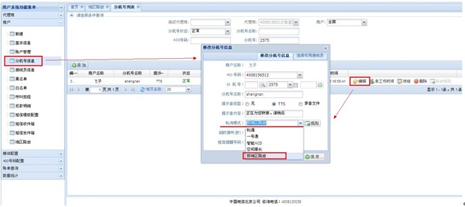 1、代理商后台:商户→分机号信息→编辑(选择所要设置的分机号)→轮循模式(选择 按地区路由)→保存。点 可以进入到(图5)、(图6)界面进行设置。见图